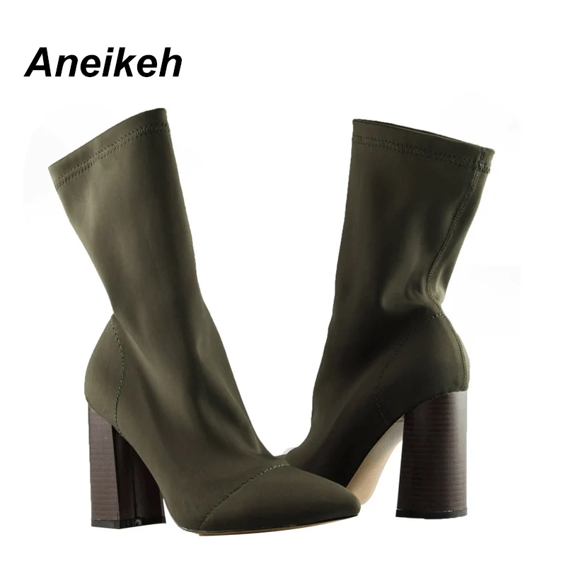 Aneikeh Slim Stretch Ankle Boots For Women Pointed Toe Sock Boots Square High Heel Boots Shoes Woman Fashion Bota Feminina 35-41