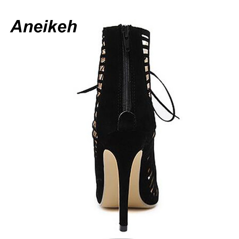 Aneikeh 2019 New Mature Mesh Women Boots Floral Lace-Up Thin High Heels Ankle Pointed Toed Party Wedding Shoes Black Size 35-40