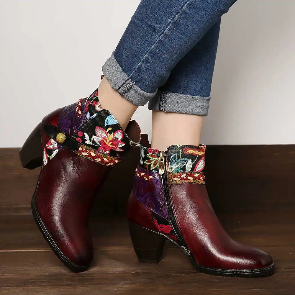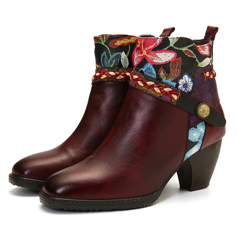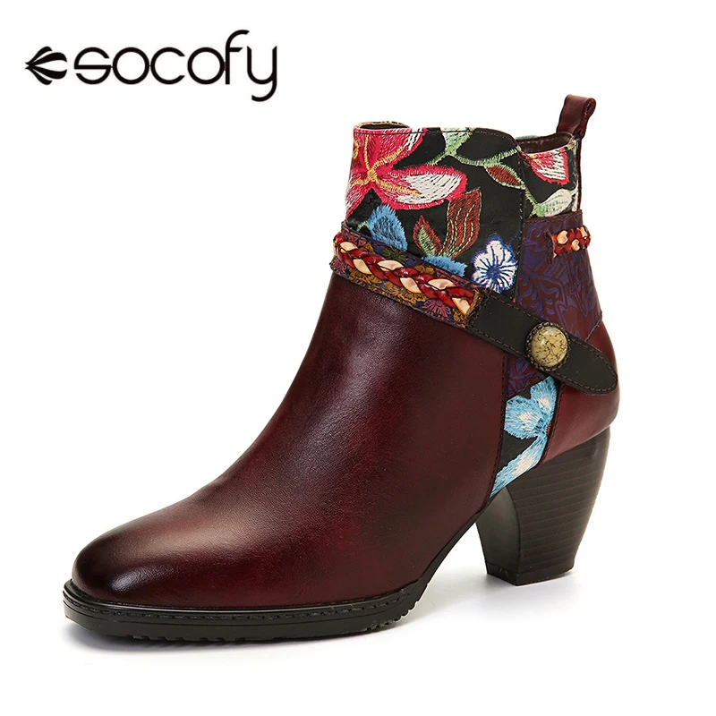 Socofy Colorful Boots Stitching Painted Flower Genuine Leather Elegant Ankle Boots Elegant Shoes Women Botines Mujer 2020
