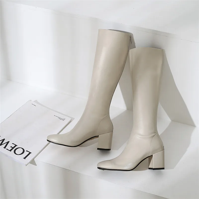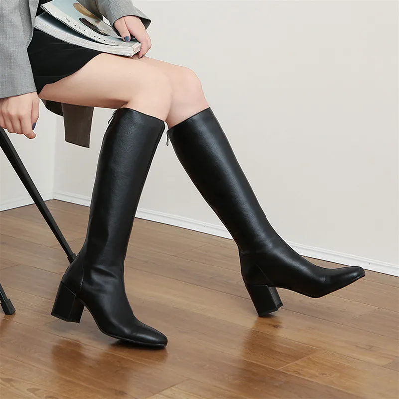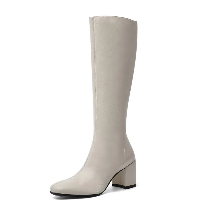 Annymoli Winter Knee High Boots Women Natural Genuine Leather Thick High Heel Long Boots Zip Square Toe Shoes Female Size 34-39