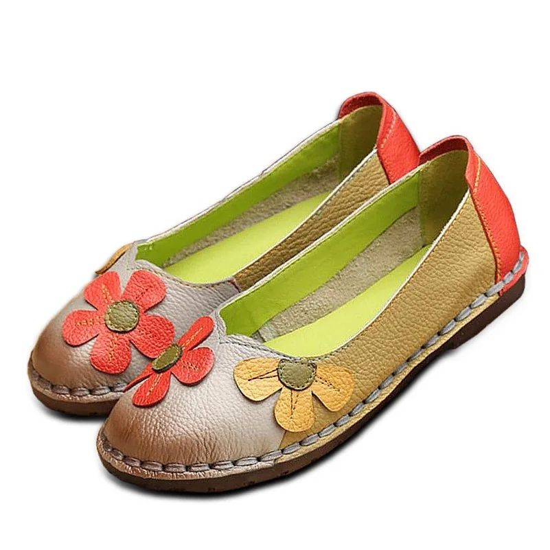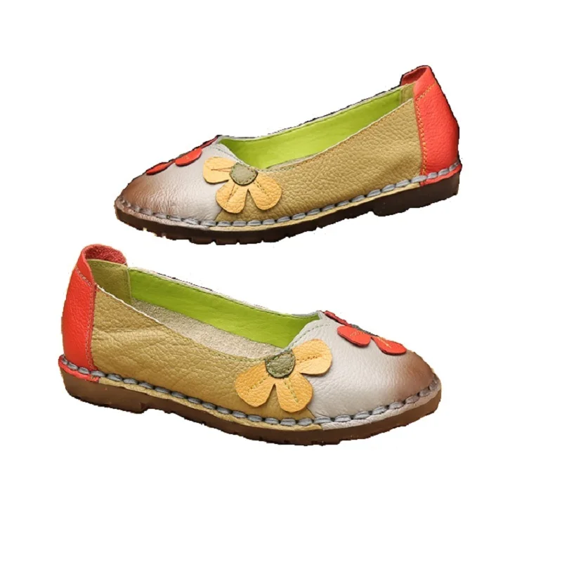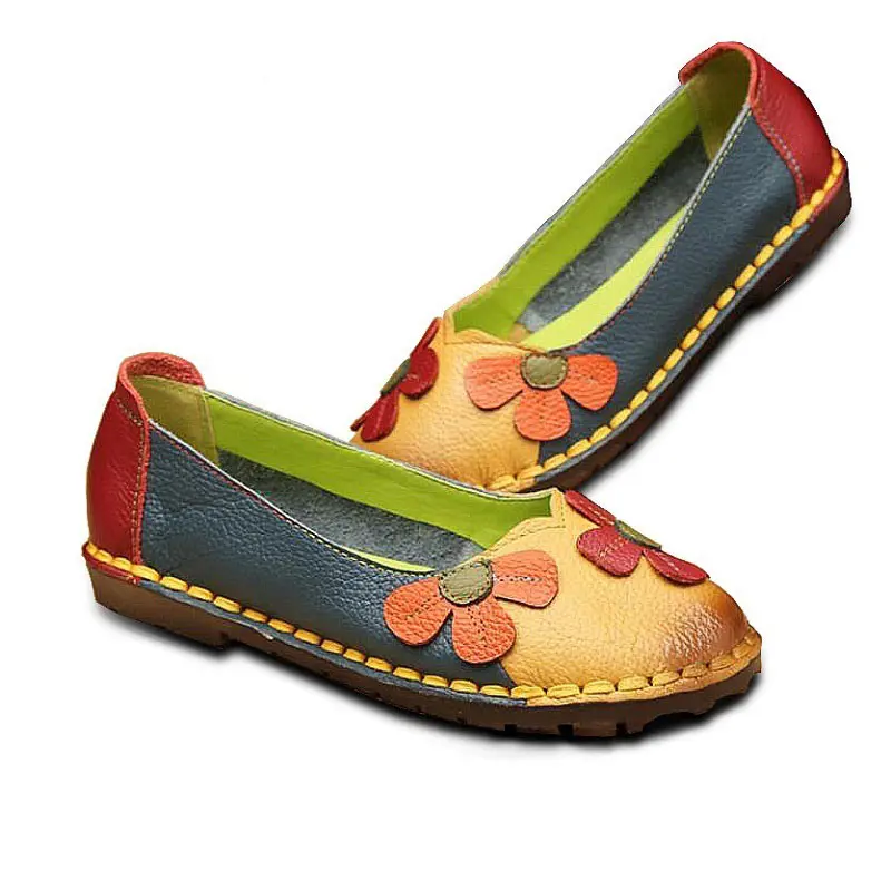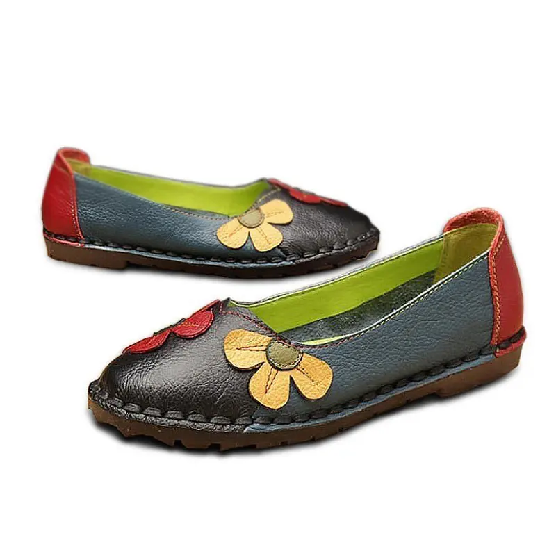 Discount Price Xiuteng Summer Fashion Flower Soft Bottom Design Round Toe Mix Color Flat Shoes Vintage Genuine Lea with FREE Worldwide Shipping!